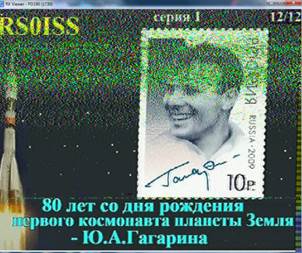 Equipment used to receive the picture from the RS0ISS was a small 2m/70cm ‘white stick’ vertical with about 20m of UR67 feeder into a 2m receiver on FM with the bandwidth set to 5kHz. Output was taken to via the computer soundcard to MMSSTV software set to 48kHz sampling frequency and PD180 mode. The Russian text at the bottom of the picture says, “80 Year anniversary of the birth of the first cosmonaut of the planet Earth -Yuri Gagarin”.